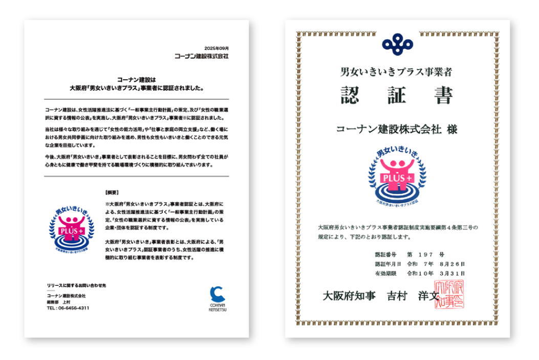 認証されました。女性活躍推進法に基づく「一般事業主行動計画」の策定、及び「女性の職業選択に資する情報の公表」を実施し、大阪府「男女いきいきプラス」事業者に認証されました。